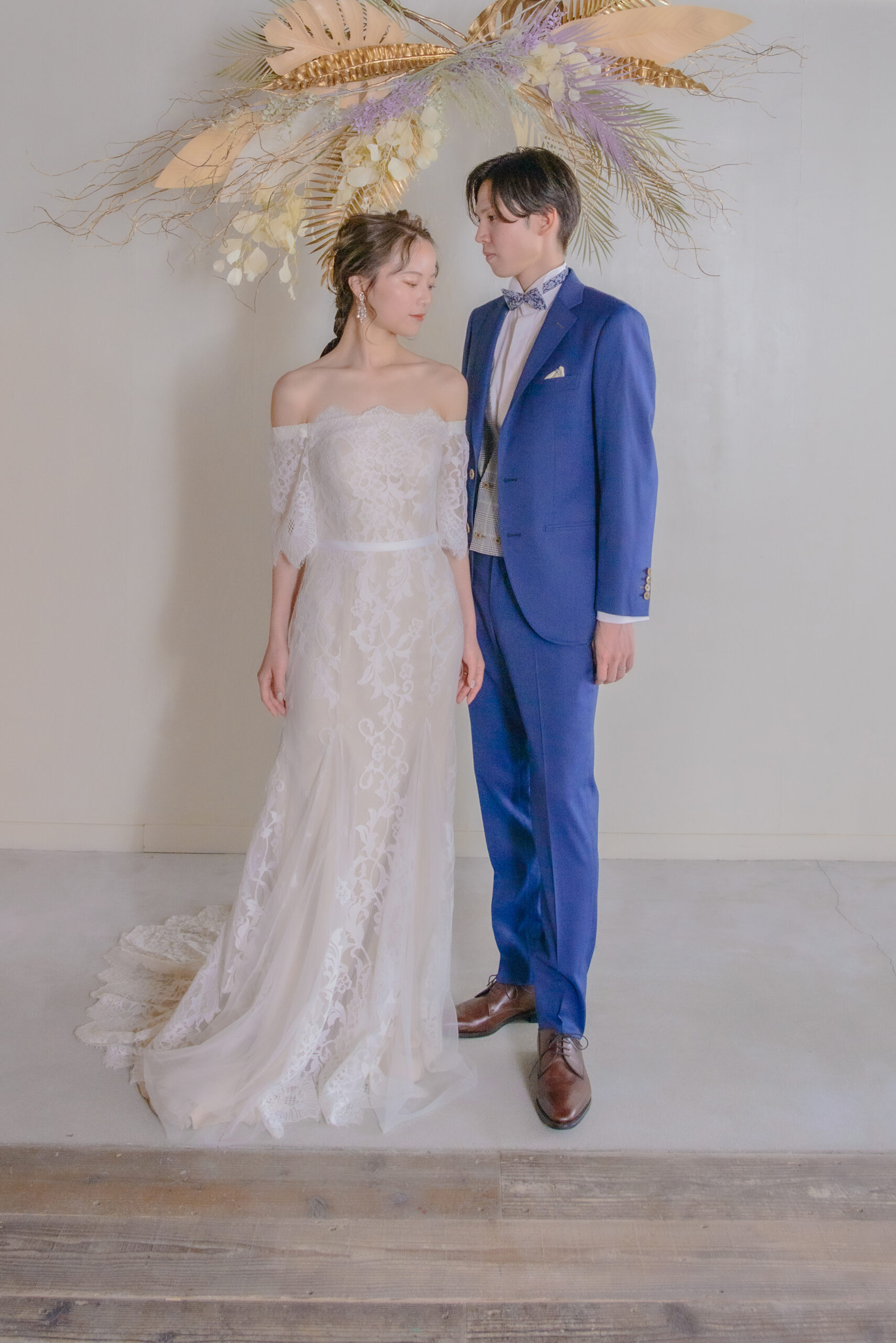オフショルダーで腕をカバーしつつもデコルテは綺麗に見えるようになっているのがポイントです。